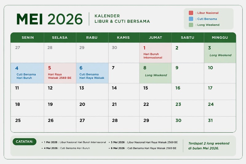 Dengan komposisi semacam ini, Mei 2026 bukan sekadar bulan kelima dalam penanggalan. Ia menjelma menjadi ruang jeda yang strategis. Bagi yang ingin beristirahat, maupun mereka yang merancang perjalanan. ***